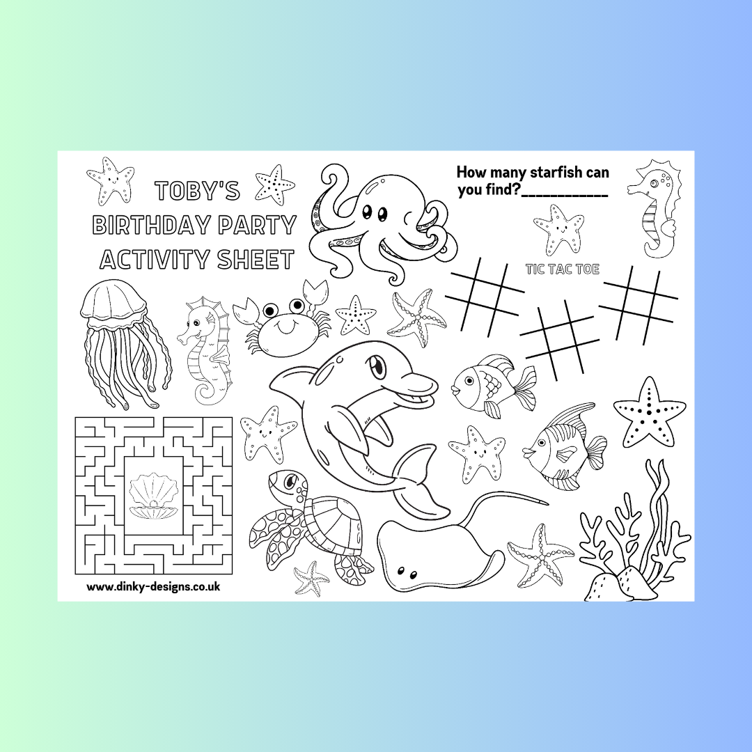 A4 Colouring Activity Sheets | Personalised Under The Sea Activity Sheets | Party Bag Favours | Party Placemats