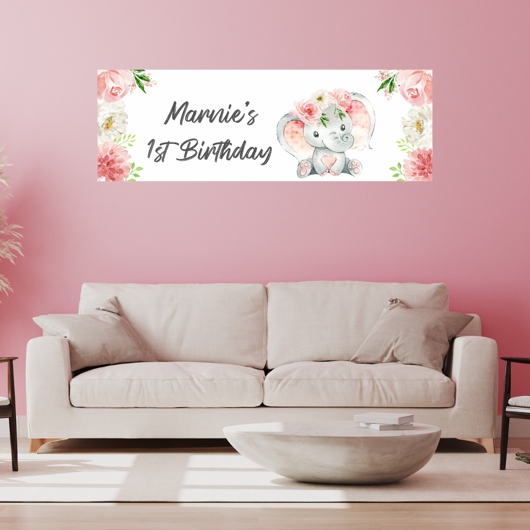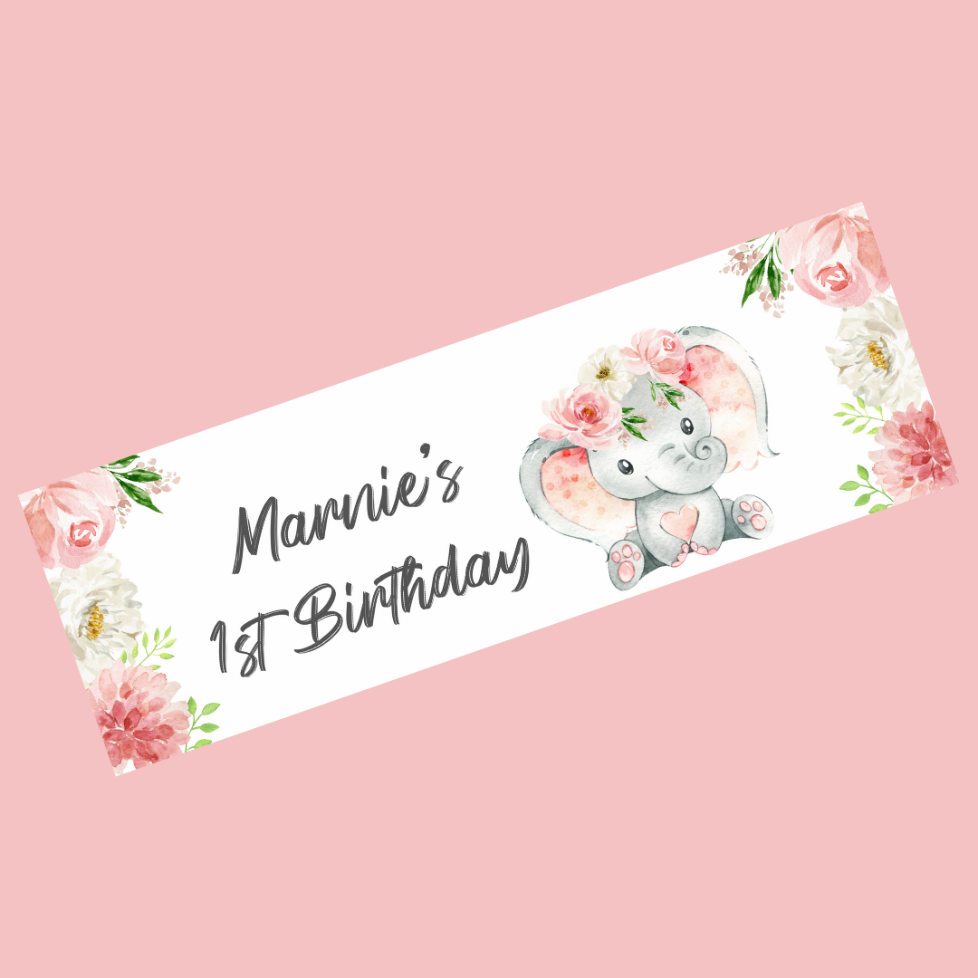 Pink Floral Elephant Crown Banner | Personalised Baby Shower Party, Birthday, Christening Banner | Baby Shower, Birthday Party Theme