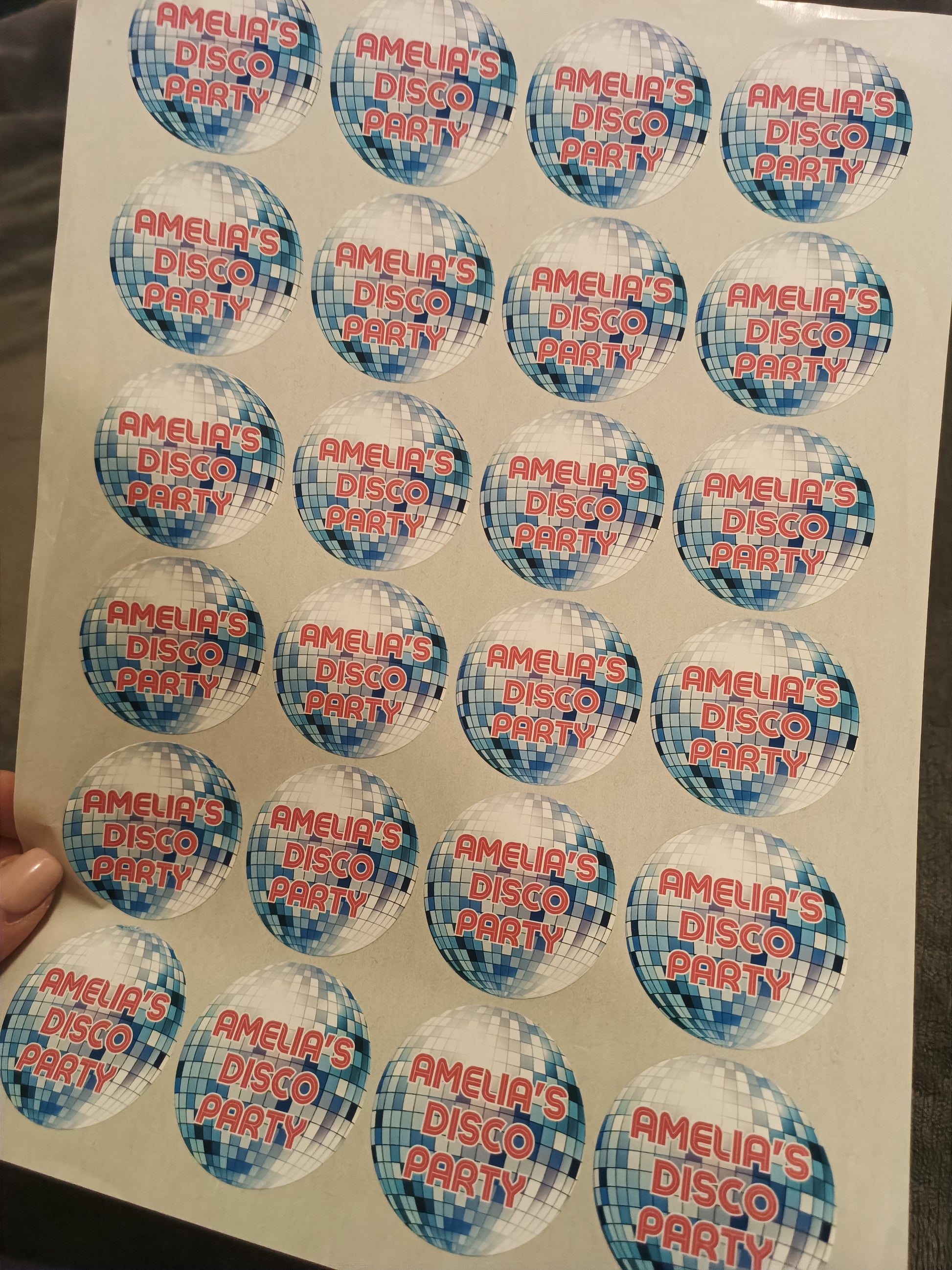 Stickers say - 'Amelia's Disco Party'
