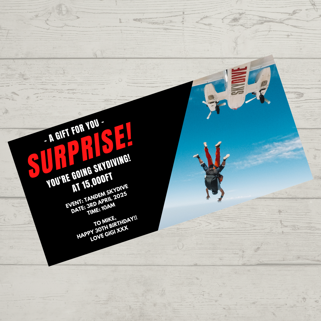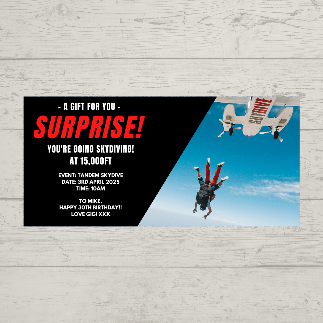 Surprise Ticket Print | Personalised Skydiving Ticket Voucher | Gift Idea